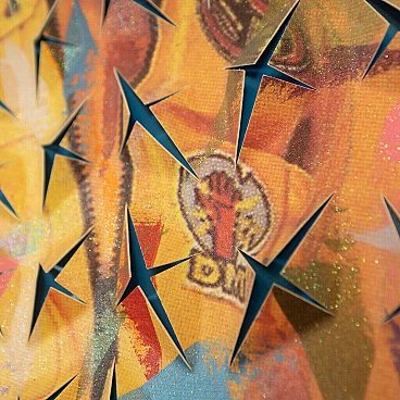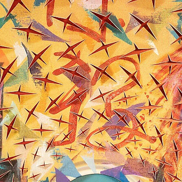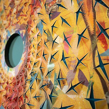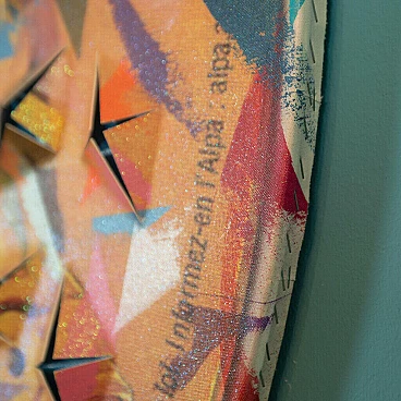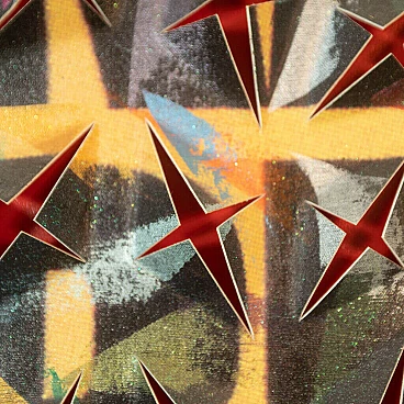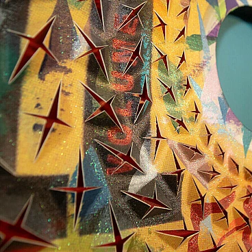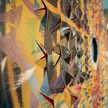 It was used a technique of acrylic colors and glitter on triple canvas, then the canvas is cut, folded and applied on colored board.