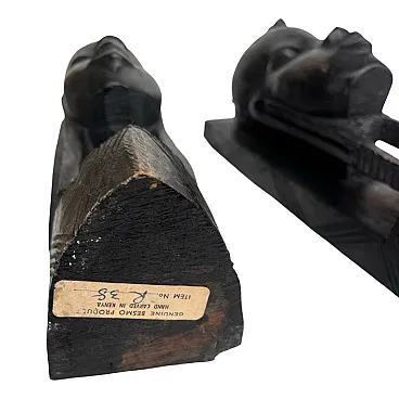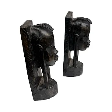 Elevate your bookshelf with these exquisite hand-carved ebony bookends from Kenya, dating back to the 1970s. Each piece is a unique work of art, depicting stylized busts with classic African features and intricate geometric decoration. The deep, warm luster of the ebony adds a touch of elegance, making these bookends not only functional but also a striking sculptural accent.