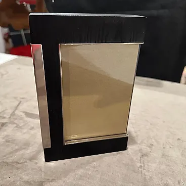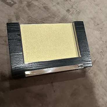 Sleek 1980s Modern Sterling Silver and Ebonized Wood Picture Frame by Silvan, Italy This exquisite picture frame is a testament to sophisticated Italian craftsmanship by the esteemed manufacturer Silvan. This frame seamlessly blends luxurious materials and a minimalist design, making it a timeless accent for any contemporary or classic interior. The frame features a striking contrast between its rich, dark ebonized wood and the gleaming sterling silver accents. The wood frame, treated to achieve a deep, almost black finish with visible grain, provides a solid and substantial presence. Integrated into the bottom edge and one side are clean, polished sterling silver bars, which add a touch of understated opulence and a distinct modern edge. A hallmark visible on the silver (referencing "925" for sterling silver and an Italian maker's mark like "200 FI", confirms its authenticity and high-quality material. The design is clean and architectural, allowing the materials themselves to be the focus, while the reflective qualities of the silver beautifully complement the depth of the ebonized wood. Perfect for showcasing a treasured photograph, an art print, or even a small mirror, this Silvan frame is not just a functional item but a statement piece that embodies the luxurious yet understated aesthetic popular in the 1980s. Excellent vintage condition. The ebonized wood shows minimal wear, and the sterling silver is polished, presenting beautifully.