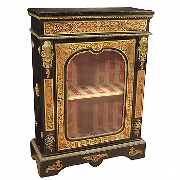 Mid-20th century French glass window sideboard, in ebonized wood richly inlaid with brass and faux tortoiseshell and adorned with gilt and chiseled bronze decorations in Boulle style. Single door sideboard, complete with working key, fitted with an interior shelf and baseboard top. Paper covered interior with several tears and signs of wear (see photos). Wooden top in character with several halos, to be stained. Structurally sound with a small lift of brass decoration (at the top of the door, see photo). Overall in fair state of preservation.