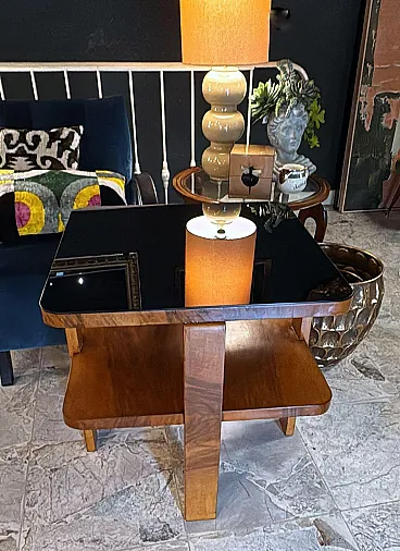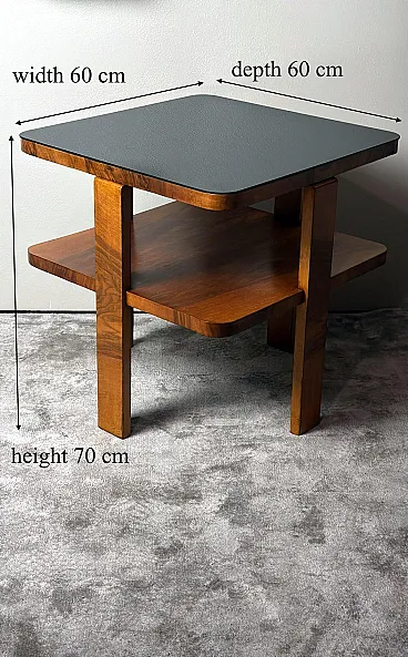 Elegant and refined Italian Art Deco square table, crafted between 1930 and 1935. The entire structure is made of solid walnut, beautifully enhanced with a decorative veneer in fine-quality European walnut (Juglans regia), also known as “Italian walnut” or “national walnut.” This prized wood is highly regarded for its exceptional durability, ease of workmanship, and natural beauty, making it one of the finest materials traditionally used in high-end furniture making. The square top is supported by four sturdy rectangular legs and features a thick black glass surface. A second shelf, placed a short distance below the top, creates a well-balanced composition and adds lightness and harmony to the overall design. The table was handcrafted in a workshop in Lissone (Monza-Brianza, Italy), a region renowned for its long-standing tradition of fine woodworking. The artisans, inspired by the refined and linear aesthetics of the Art Deco period, designed a compact piece with clean and decisive lines, giving it a timeless elegance. The design strikes a perfect balance between austerity and sophistication, while the meticulous finishing highlights the natural beauty of the walnut grain. Thanks to the excellent properties of walnut—particularly suitable for sanding, varnishing, and polishing—the surface achieves a smooth and lustrous finish. The result is a discreet yet distinguished piece, capable of creating a calm and refined atmosphere while adding warmth and understated elegance to any interior. The table has been professionally restored and is in excellent condition. Dimensions: width 60 cm (23.6 in), depth 60 cm (23.6 in), height 70 cm (27.6 in).