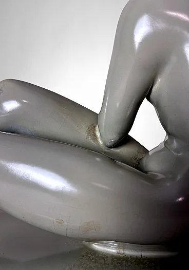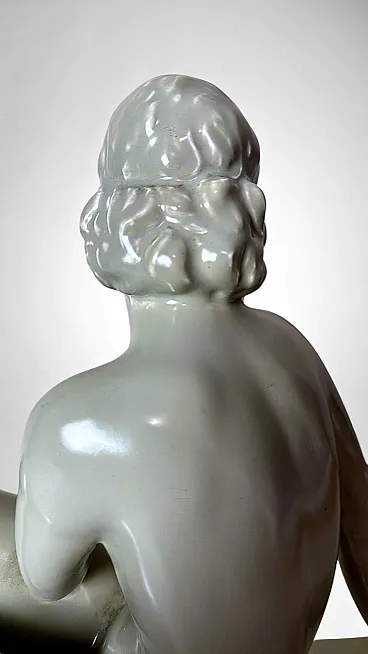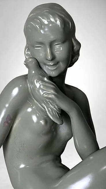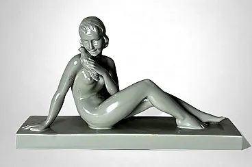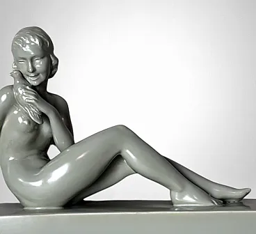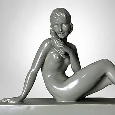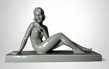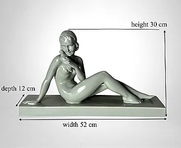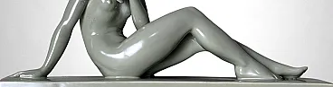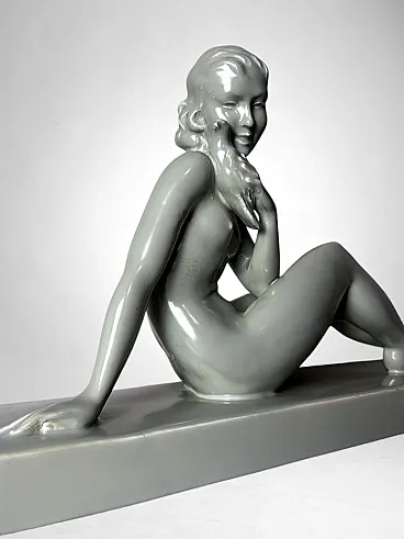 Elegant glazed ceramic sculpture depicting a nude young woman seated on an elongated base. Her composed posture, soft contours, and streamlined modeling clearly reflect the Art Deco aesthetic. On the underside appears an impressed mark with the letters “STR” surmounted by a crown, likely associated with the ceramic tradition of the Lunévillois region. Although no conclusive archival sources link this mark to the historic Faïencerie de Lunéville Saint-Clément—long regarded as one of France’s most distinguished manufacturers of faïence and decorative sculpture—the style, craftsmanship, and proportions closely recall the factory’s Art Deco production of the 1920s–1930s, a period that saw artists and sculptors such as Géo Condé and Charles Lemanceau at work. The piece is intact, with a uniform, lustrous glaze; the mark on the base is present but not sharply defined. Due to the absence of documentation confirming the attribution of the “STR” mark, we describe the origin as French manufacture (Lunévillois area), in Saint-Clement / Art Deco style, without asserting guaranteed authenticity. The sculpture is distinguished by well-balanced proportions and harmonious modeling: the young woman’s slender, composed figure conveys an elegant and understated grace. Overall, it is a refined decorative object, well-suited to a wide range of interior settings. Lightweight and hollow, the piece is in good overall condition, with only a minor glaze imperfection on one arm, likely resulting from the second kiln firing. Dimensions: Length 52 cm (20.47 in), Depth 12 cm (4.72 in), Height 30 cm (11.81 in).
