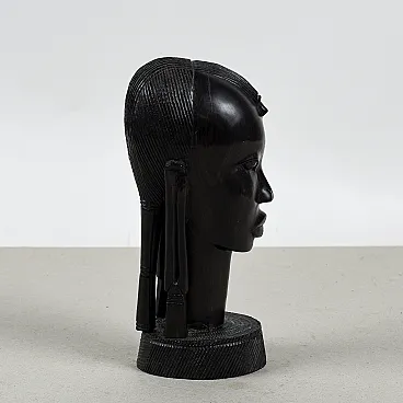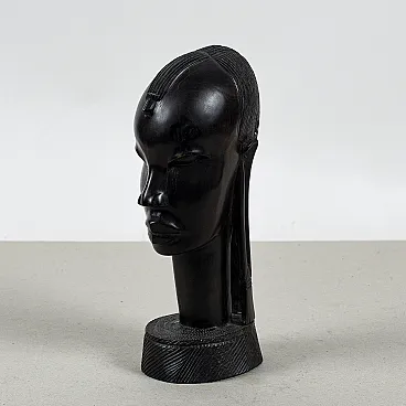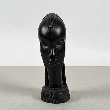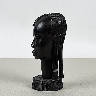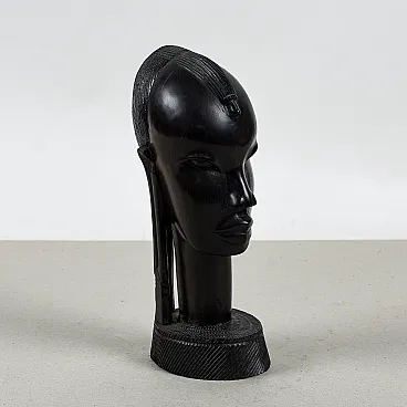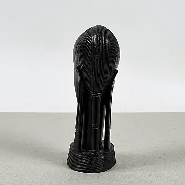 This refined carved bust of a woman, made in vintage African style, is an example of ethnic art with a strong decorative impact. The work captures the essence of modern art inspired by African sculptural traditions, characterized by elegant lines and a formal stylization that enhances its grace and timeless character. The piece is entirely hand-carved in dark wood, with craftsmanship that defines minute details such as the elaborate hairstyle and delicate facial features. The glossy finish of the material highlights the natural grain of the wood, giving it depth and a smooth texture to the touch. Ideal for enriching a collection or as a unique piece in a contemporary setting, this bust adds a touch of exoticism and refinement. It is the perfect choice for those looking for a design object with multicultural charm and great aesthetic value.