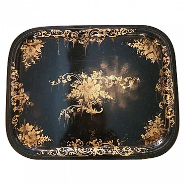 Hand painted Napoleon III metal toleware tray with gold paint, 19th century