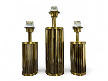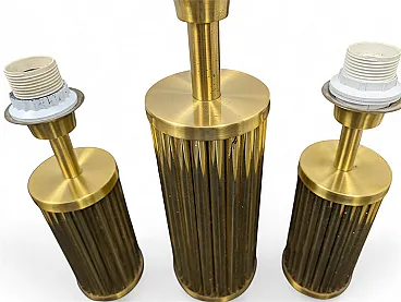 Questi raffinati lumi da tavolo presentano un design d'ispirazione brutalista e Hollywood Regency, caratterizzato da un corpo cilindrico interamente realizzato in ottone con una lavorazione a cannucciato verticale che crea suggestivi giochi di luce e ombra. Il set si compone di tre elementi di diverse altezze che permettono di creare dinamismo in una composizione d'arredo, mantenendo un'estetica lussuosa e scultorea grazie alla finitura dorata e alle linee rigorose. La patina naturale del metallo e i segni del tempo visibili sulla superficie ne sottolineano l'autenticità vintage, rendendoli pezzi unici ideali per arricchire ambienti sofisticati.