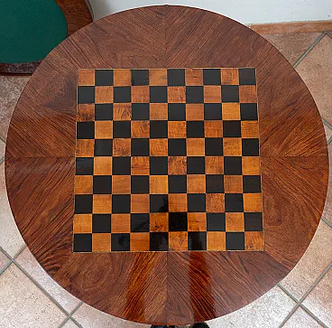 Description: Antique Napoleon III coffee table in precious exotic woods with inserts of gilded bronze elements belonging to the second half of the 19th century. The circular top has an inlay in the center depicting a rural scene with characters made with many precious woods. Below the top we find a chessboard also made with contrasting woods. The band under the top is embellished by the presence of a geometric patterned inlay and includes two drawers and two small desks. The four feet have a truncated pyramid shape and end with bronze shoes. Provenance: 19th century France. Condition: Restored by our master craftsmen with traditional shellac and handmade alcohol method. Measurements: Diameter 65cm. Height 78cm. Document: Certificate of Authenticity.