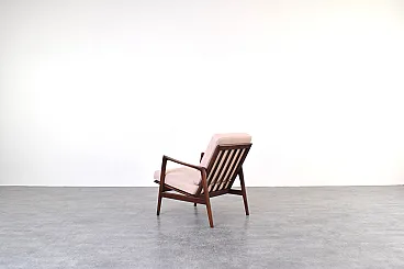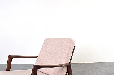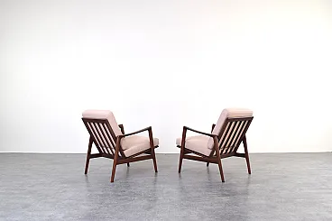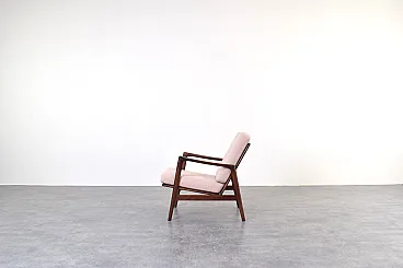 The frame of the armchairs is made of solid beech and has been professionally and carefully restored by removing the old coatings, staining, and finishing in varnish. The restoration was carried out by a talented and experienced carpenter with over 20 years of experience. The seat and backrest cushions have been reupholstered in a beige-powder-pink recycled wool fabric. Thanks to this treatment, the chairs look beautiful and will serve their new owner for many years without fear of damage or wear and tear from everyday use.