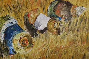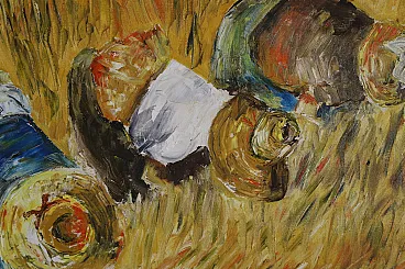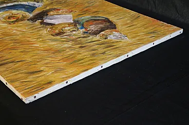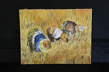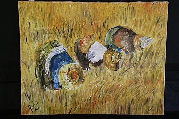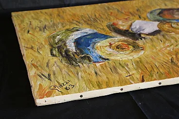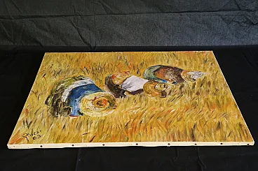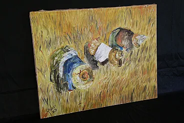 Perhaps inspired by Jean François Millet's 1857 masterpiece, this oil painting on canvas depicts a scene of peasant life belonging to a not too distant past.