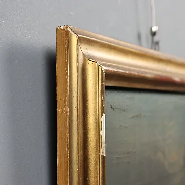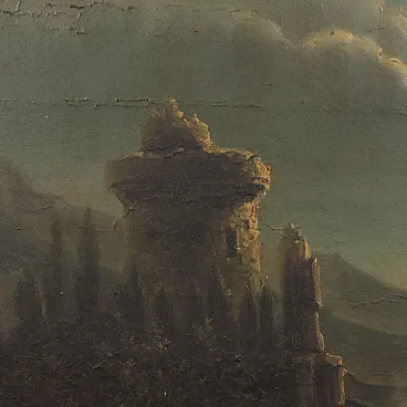 Oil on panel. A striking nighttime view of a flat landscape with a small body of water. A farmer rides along the dirt road that runs alongside it, carrying his full baskets, while further back, several herdsmen guide their animals, urging them to stay on the path. Above, the full moon emerges from the clouds, illuminating the landscape. The work is presented in an early 20th-century gilded frame.