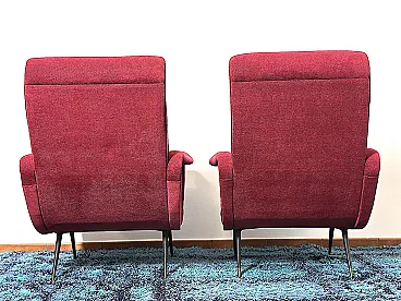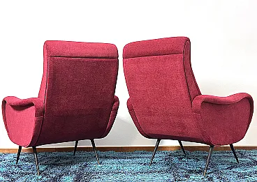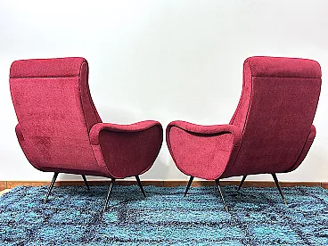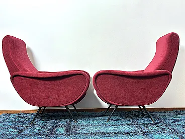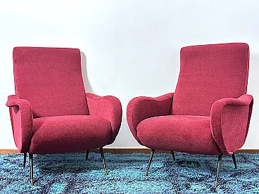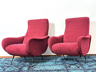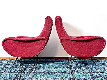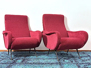 Pair of "LADY" Armchairs from the 1950s Design attributed to MARCO ZANUSO, a masterpiece of Made in Italy, Lady was awarded the Gold Medal at the IX Triennale of Milan in 1951. The armchairs are of Italian manufacture, completely restored with new upholstery and interiors, wine-coloured cotton fabric, unmistakable style of the shell by Designer Marco ZANUSO, brass feet with the typical design from the 1950s. PERFECT CONDITIONS Measurements Height 95 cm/Width 74 cm/Depth 90 cm/Seat height 40 cm/Seat 52 cm