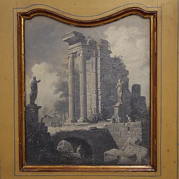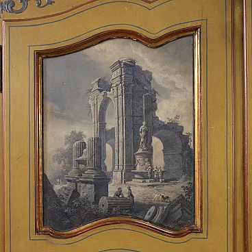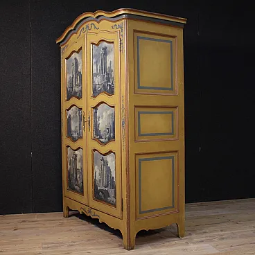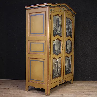 Small Piedmontese wardrobe from the mid-20th century. Carved, lacquered, gilded and hand-painted furniture of excellent quality. Doors adorned with six highly attractive colored grisaille-effect prints depicting views with ruins in a romantic style. Two-door cabinet complete with key and working lock which offers several shelves and a clothes rail inside, of good capacity and service.