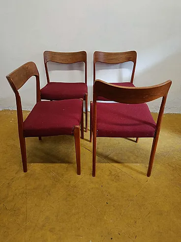 This refined set of 4 vintage Danish chairs by Henning Kjærnulf represents a paradigmatic example of 1950s-60s Scandinavian design. The elegant teak structure combines with the burgundy covering, a shade that gives sophisticated character to the dining area.