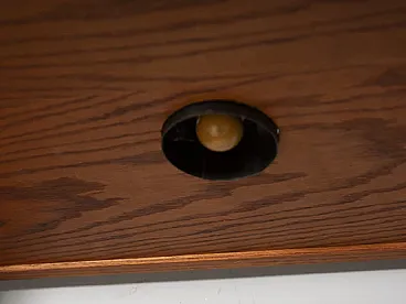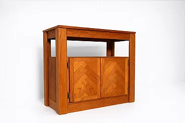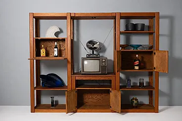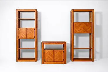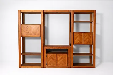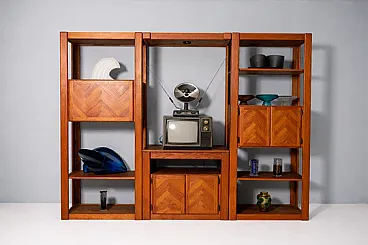 This sectional living room wall dates to the 1960s–1970s and originates from the American furniture tradition of modular residential systems. The design reflects the robust construction, precise joinery, and decorative veneered surfaces typical of American production from this period, with geometric patterns applied to the cabinet doors.