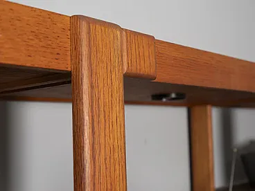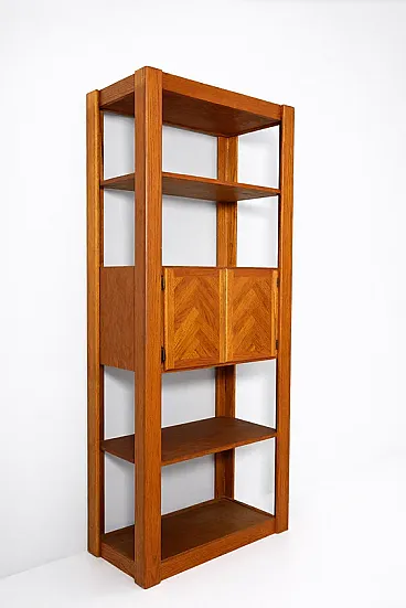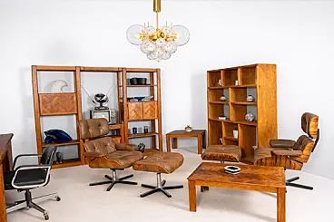The set consists of three freestanding modules that together form a complete living wall. Two taller units are visually connected by an upper ramp with an integrated spotlight, a characteristic feature of American sectional furniture of the era. The structure allows for flexibility, as cabinets and shelves are height-adjustable and repositionable, adapting easily to different interiors and storage needs.