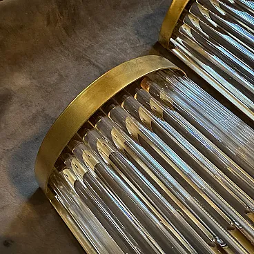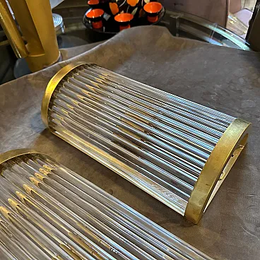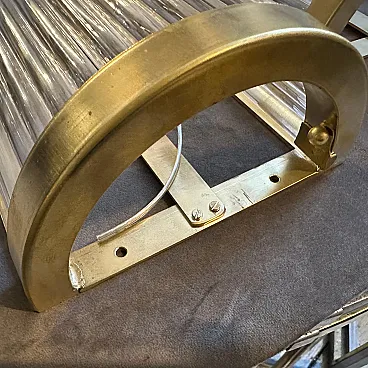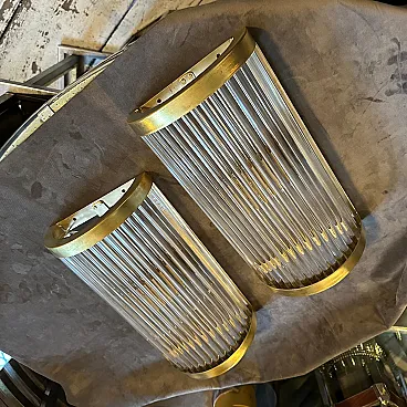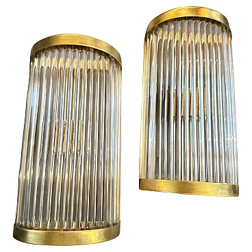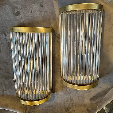Exquisite Pair of Sciolari-Style Mid-Century Modern Brass and Glass Italian Wall Sconces A stunning pair of Italian Mid-Century Modern wall sconces, masterfully crafted in the coveted style of Gaetano Sciolari. These elegant fixtures embody the sophistication and geometric allure characteristic of the era, making them a perfect addition to any discerning collection or luxurious living space. Each sconce features a striking semi-cylindrical form, meticulously adorned with a cascade of vertical cylinder glass rods that beautifully diffuse light, creating a warm and inviting ambiance. The clear, high-quality glass is perfectly complemented by lustrous brass accents at the top and bottom, which exude a rich, aged patina that speaks to their authentic vintage charm. These sconces are not merely lighting fixtures; they are sculptural works of art that command attention. Whether gracing a grand hallway, illuminating a refined living room, or adding a touch of glamour to a contemporary bedroom, they promise to infuse your space with unparalleled elegance and mid-century flair. Excellent condition, consistent with age and use, brass finish commensurate with age, adding to its authentic character. Fully functional.