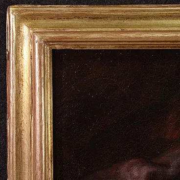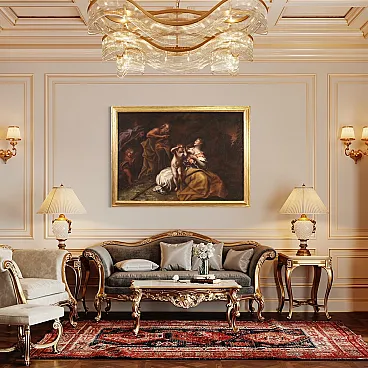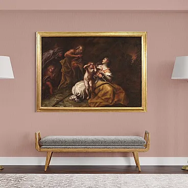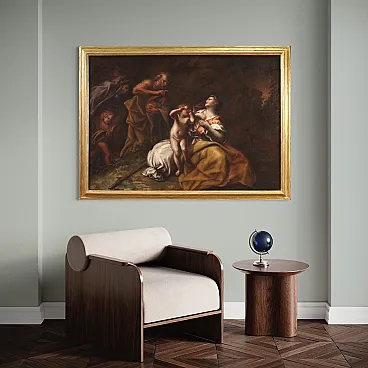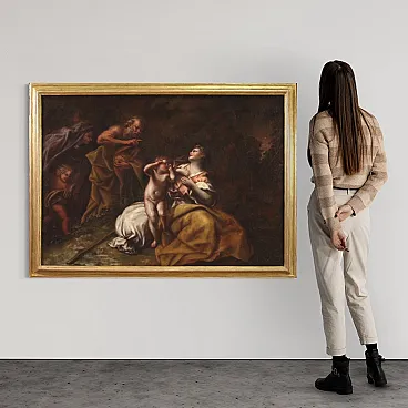 Ancient Italian painting from the 17th century. Oil work on canvas depicting a biblical subject, Abraham drives out Hagar and Ishmael, of excellent pictorial quality. According to the story of Genesis, at the behest of his wife Sarah, Abraham was forced to chase away the Egyptian slave Hagar with whom he had previously had another son named Ishmael. All this had happened to prevent Isaac from having to share his father's inheritance with him. A painting of great pictorial intensity, characterized by a skilful use of chiaroscuro and a remarkable quality of the drapery.