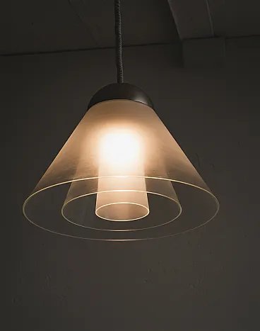 The “LS189” pendant lamp by Carlo Nason for Mazzega is a vintage 1970s design piece made of hand-blown Murano glass. This highly collectible lamp, known for its sculptural elegance and unique cone shape.