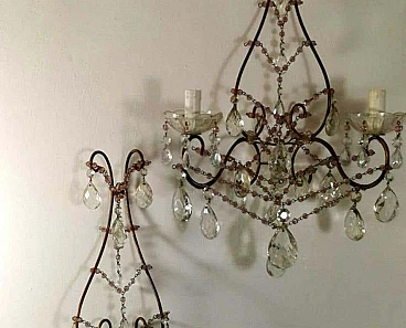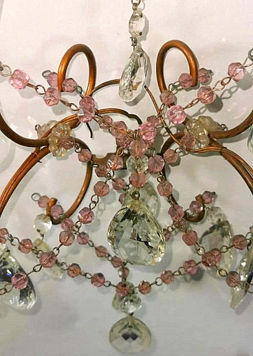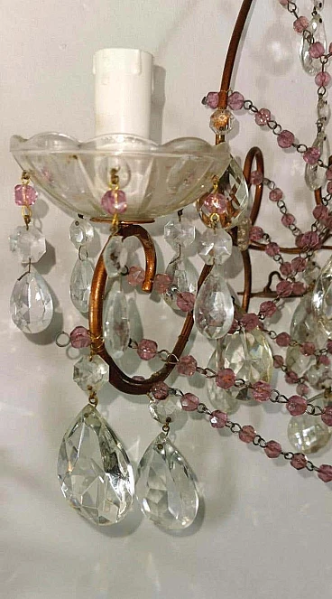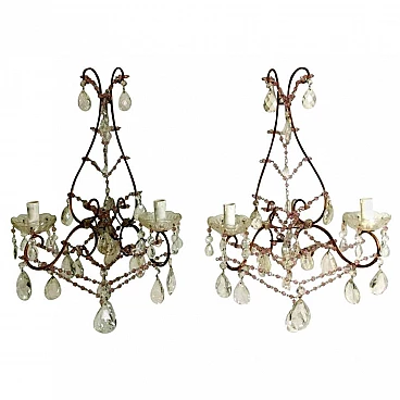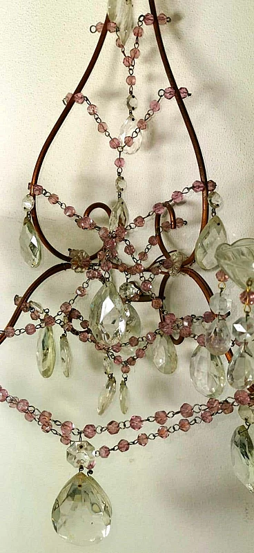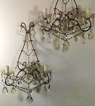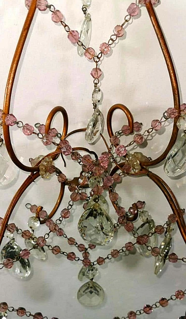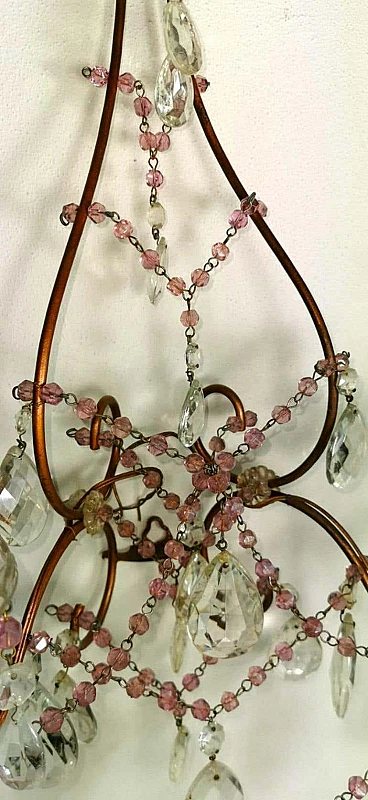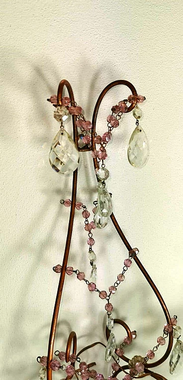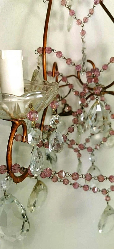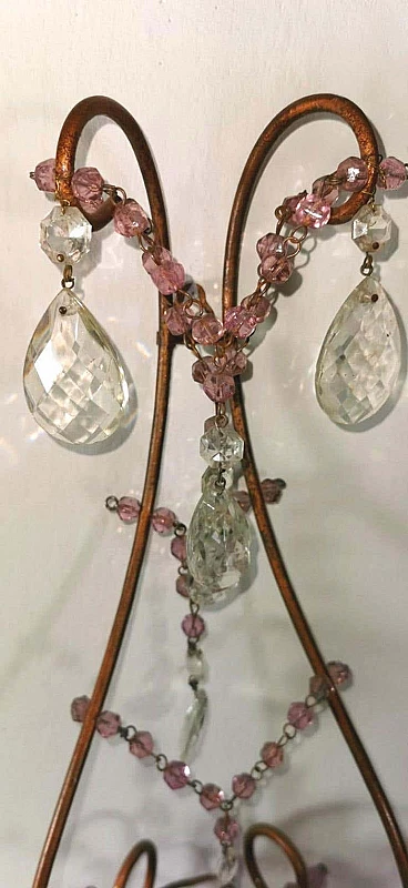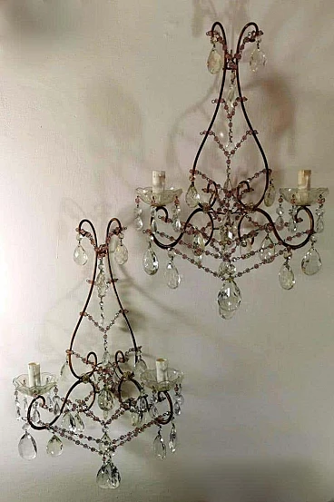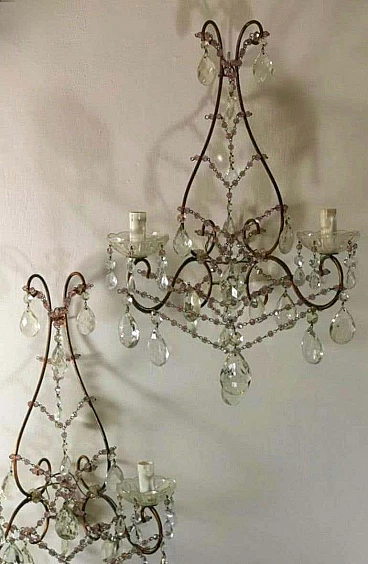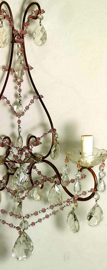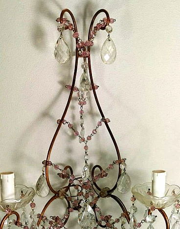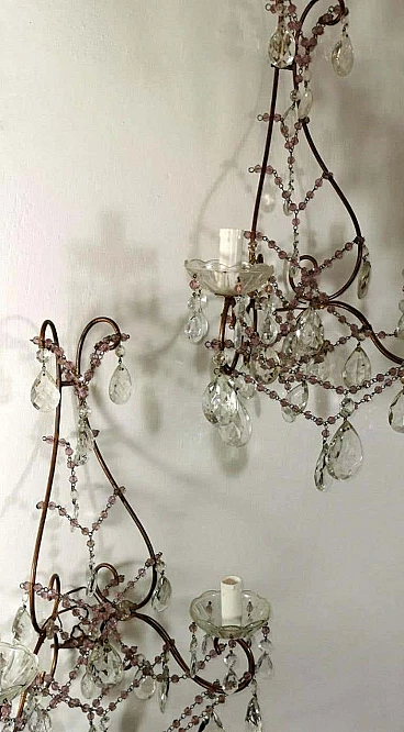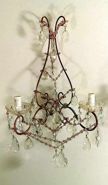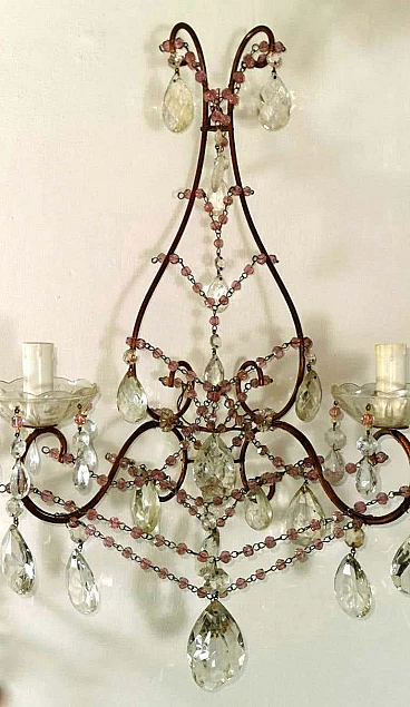 The appliques have an elegant and light mounting in the gilded bronze wire on which metallic chains are skillfully applied with small faceted pink crystal spheres, to enrich the whole artistic work were also inserted white crystals cut and ground in the shape of a drop, then polished perfectly. Two candle socket contain the fake candles on which the bulbs can be placed. The wall sconces are in the Maria Theresa style, a style created in 1743 by the Master Glassmakers of Venice in honor of the Austrian Empress Maria Theresa (1711-1780 founder of the Habsburg-Lorraine family), for the manufacture of the ceiling and wall chandeliers. They were impressive objects with protruding arms and decorated with drop-shaped or spherical elements made of crystal. This wall sconces are two manual and sumptuous works by skilled Venetian craftsmen, masters in glass and crystal working, who executed them between 1880 and 1890 in their fascinating workshops in Venice. Their elegance and refinement allow them to be placed in any environment. The electrical system is working but the wiring is European, the compatibility of the voltage in other states must always be verified by an electrician before use.