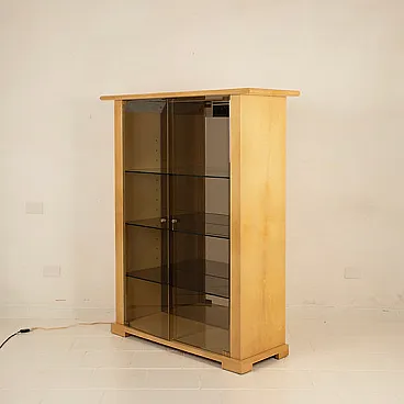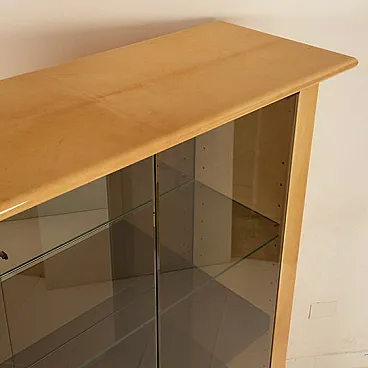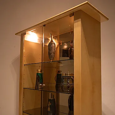 The structure is conceived as a monumental display case: the smoked glass doors and shelves interact with mirrored back panels, generating a sophisticated play of refractions and visual multiplications that amplify the internal space and enhance the objects on display. The original integrated internal lighting is not merely functional but becomes an integral part of the design language, transforming the cabinet into a luminous and scenographic presence—almost museological—capable of animating the space even when closed.