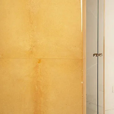 The piece is entirely clad in natural parchment, an iconic and distinctive material of Tura’s production, chosen not as a simple surface covering but as a true structural element of the design. The surface displays its characteristic warm and vibrant tonality, with subtle tonal variations and natural markings that lend visual depth and absolute uniqueness to each individual panel.