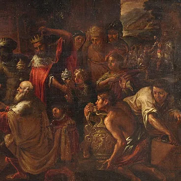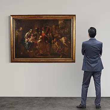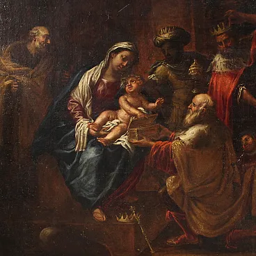 Genoese school of the mid-17th century. Oil work on canvas depicting a religious subject of great charm, the adoration of the Magi. The composition is rich, theatrical and strongly narrative. The painting is set in a dim interior, illuminated by a warm light that converges on the protagonists. The Madonna, seated and wrapped in a splendid blue mantle with a pink tunic, supports the naked child, rendered with fleshy softness and childlike naturalness.