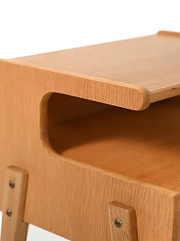 Pair of 1960s Scandinavian bedside tables in oak, characterized by a shaped structure with double shelf and light proportions.