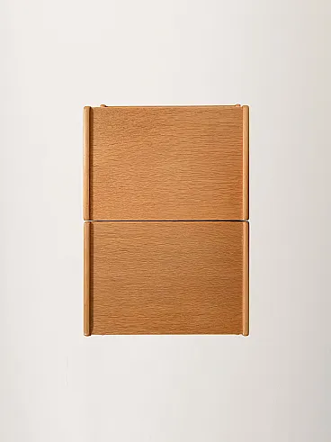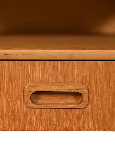 Pair of vintage 1960s Scandinavian bedside tables in oak, characterized by a structure with a shaped profile that generates a refined double continuous shelf. The main body, soft and compact, integrates a drawer with a carved handle, discreet and perfectly harmonized with the design. The legs, fixed to the outside of the volume, present the typical tapering of the period, emphasizing the balance between solidity and formal lightness. A measured and coherent example of mid-century Nordic design.