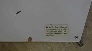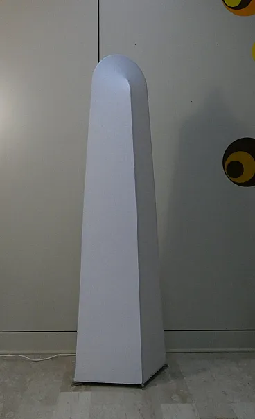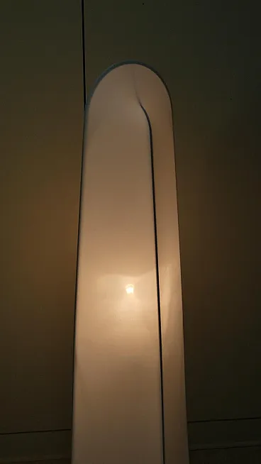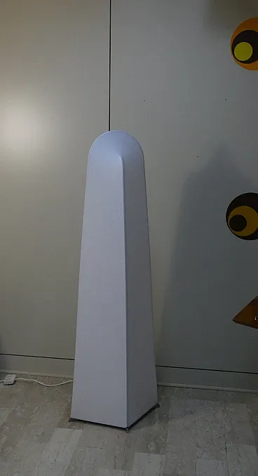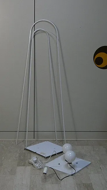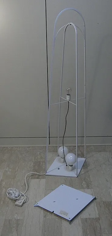 Kazuki model floor lamp created in 1976 by the architect designer Kazuide Takahama and produced by Sirrah in 1980. The structure of the lamp is composed of a double overlapping arched skeleton, in white painted metal, placed on a rhomboidal base also in white painted metal which rests on chromed steel rods. The lampshade is made of white stretch lycra fabric, kept taut by the structure. This fabric is easily removable from the structure, and can be easily washed at 30° in the washing machine. Produced by Sirrah in 1980. Excellent condition, like new... the fabric and metal have no defects as the lamp was never used, but kept in the box. Dimensions: L. 42 cm, H. 160 cm, D. 55 cm.
