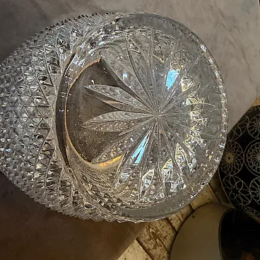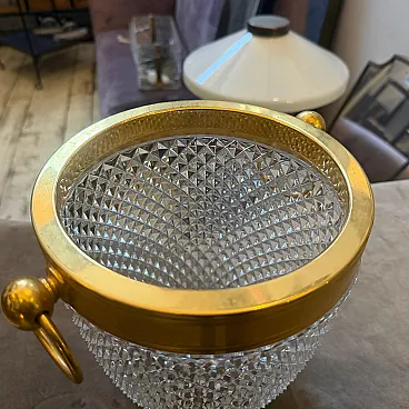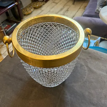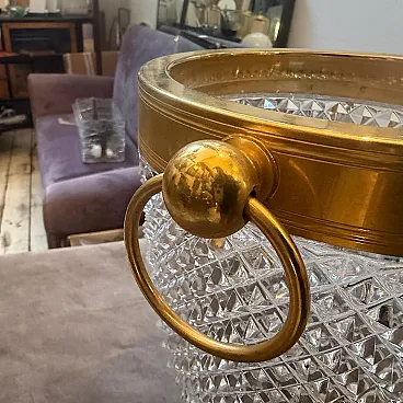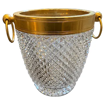 This 1980s Modernist French wine cooler is an elegant blend of luxury and functionality. It features a stunning heavy crystal body with a textured diamond-cut pattern, which enhances its brilliance and allows light to reflect beautifully. The intricate detailing of the crystal gives the cooler a sophisticated, timeless aesthetic. Accentuating its refined design, the upper rim is adorned with a sleek gold plated band, adding a touch of contrast and glamour. Two elegantly curved handles, also gold plated, are attached to the sides, providing both visual appeal and practical ease for handling. This piece embodies the essence of Modernist design, combining clean lines with exquisite craftsmanship. Ideal for entertaining, it would make a striking addition to any bar or dining setting, exuding both vintage charm and contemporary elegance. It's in perfect condition and ready for a bottle of champagne.