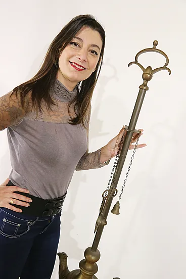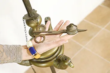 A flame extinguishing scissors, a bell and a wick cleaner create the tool kit of this lamp.