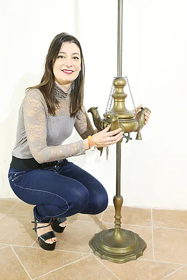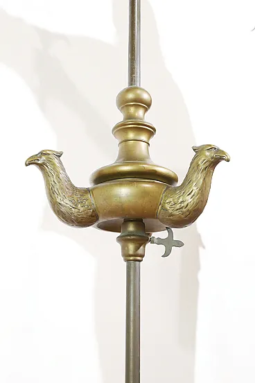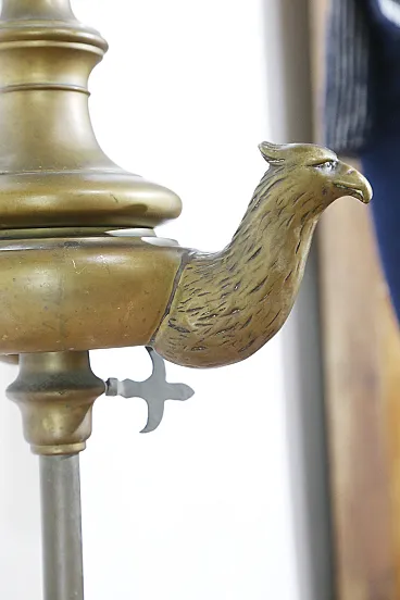 On the stem runs a large tank for the lampante oil with three flames in which the wick holders are made in neo-classical eagle head style.