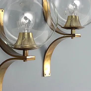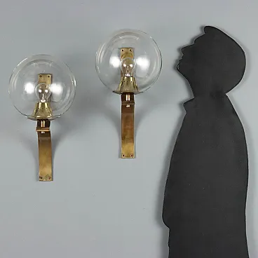Pair of elegant vintage wall lamps with brass frames and clear glass sphere diffusers. One E27 bulb.