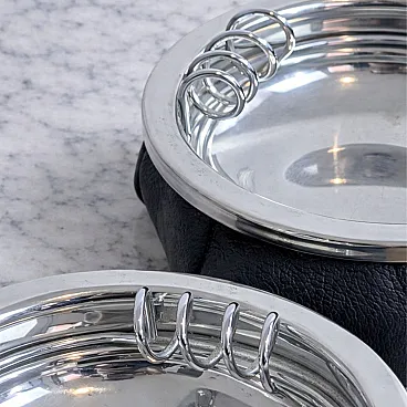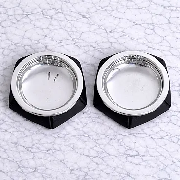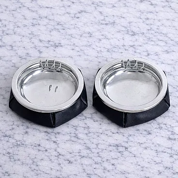 This pair of Italian ashtrays dates to the 1970s and exemplifies the refined material sensibility typical of Italian design accessories from the period. Each ashtray is crafted with a padded black leather base, softly contoured and carefully finished, combined with a polished metal structure that introduces a clean and elegant contrast.
