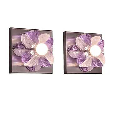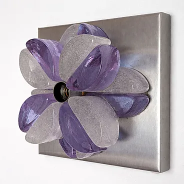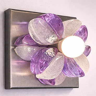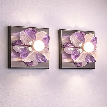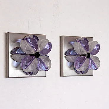 This pair of Mid-Century Modern wall sconces was designed by Albano Poli and produced by Poliarte in Italy in the 1970s. The wall lights feature a sculptural composition of Murano glass elements arranged in a radial shape around a central light source, fixed to a square metal base.