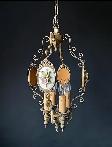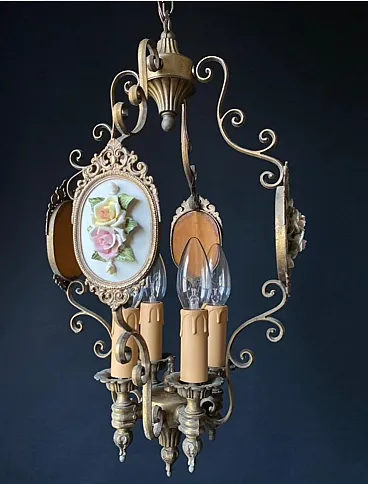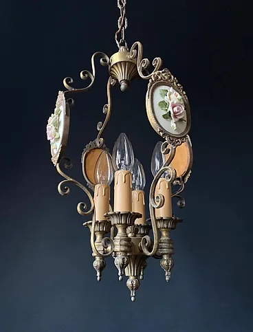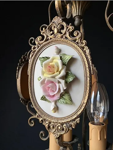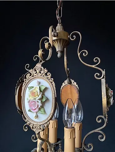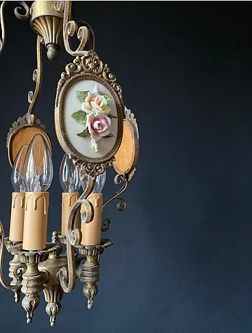 The chandelier is made of brass and bronze. Impeccable artistic forging. The chandelier is decorated with miniatures with porcelain flowers. Very beautiful and delicate handwork!