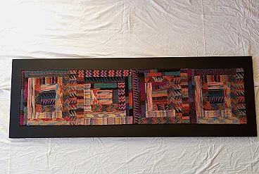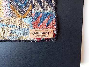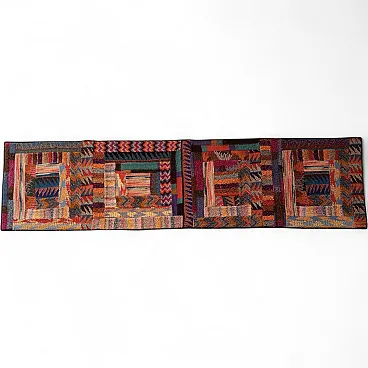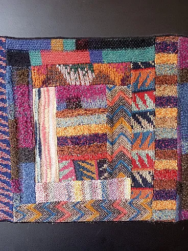 This Ottavio Missoni tapestry, measuring 182 cm x 60 cm, is composed of rhythmically arranged squares and panels. Constructed like a textile patchwork, each module features the classic zigzag patterns, stripes, and geometric shapes typical of Missoni's style, woven together in a dynamic yet harmonious composition with a strong visual impact. The color palette is rich in deep blues, purples, turquoises, oranges, reds, powder pinks, and neutral touches that alternate to create depth and movement. The variations in texture and density of the fabric add a dimension, making the tapestry almost vibrant to the eye. Overall, the work combines textile craftsmanship and artistic research, transforming a decorative element into a veritable fabric painting, ideal as a centerpiece for a contemporary wall or as a sophisticated accent in a designer setting. Tapestry by Ottavio Missoni with his signature design. It features repeating squares in shades of blue. The textures and colors alternate, creating depth and visual dynamism. The outer edge is finished in black, elegantly framing the whole piece. Made of pure wool in the 1980s, it measures 200 cm x 79 cm. It has a black frame at the top that allows it to be easily hung on the wall. Ottavio Missoni was born on February 11, 1921, in Dubrovnik, on the Dalmatian coast. His mother, Teresa de Vidovich, was a countess.