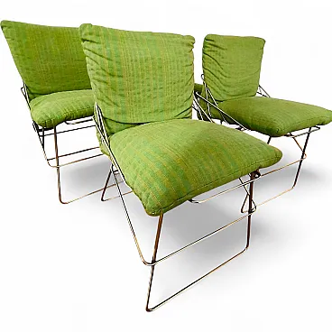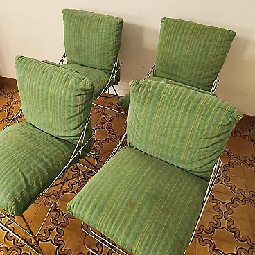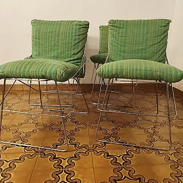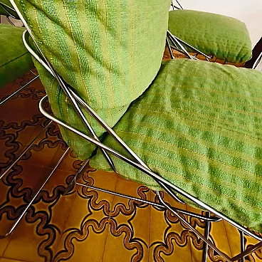 Sof Sof model chairs - Chromed steel rod structure and padded cushions covered in green fabric. Structure in excellent condition, fabric needs replacing, worn over time. The chairs are stable, not very heavy.