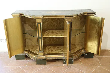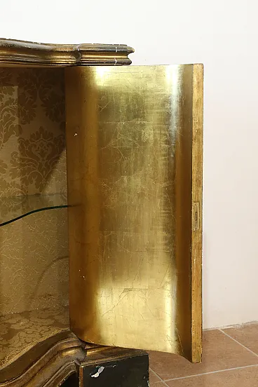 The interiors are entirely covered in damask fabric, the shelves are in tempered glass and the internal parts of the doors are entirely gilded with gold leaf.