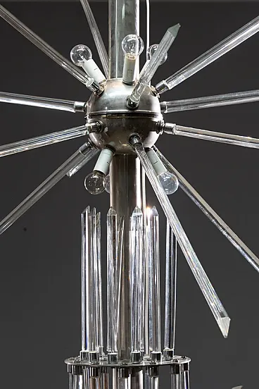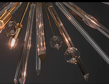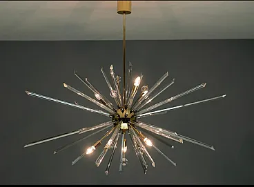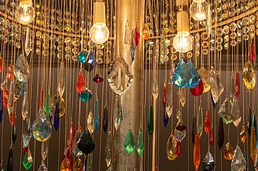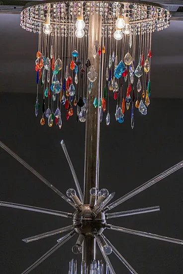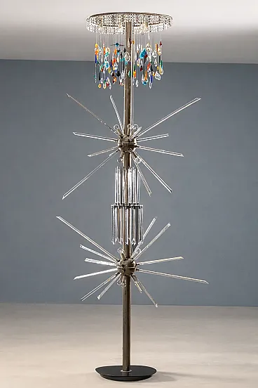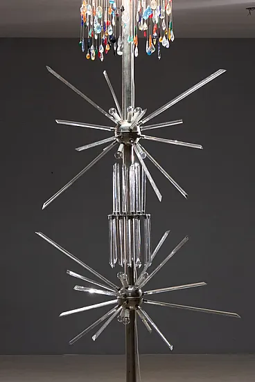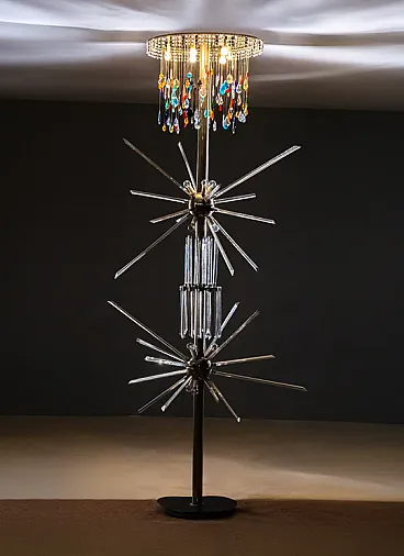 The lamp features a vertical metal structure articulated with starburst glass elements and suspended hand-cut glass pendants in a vivid spectrum of colors. The dynamic composition creates a strong visual presence and transforms light into a decorative, almost kinetic experience.