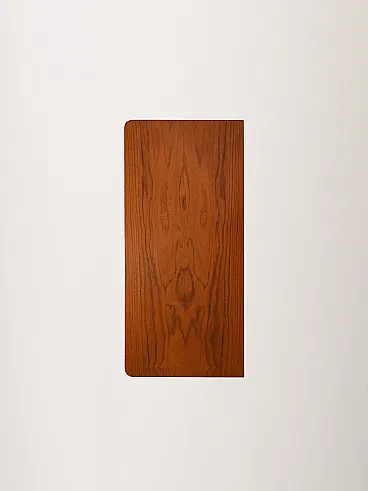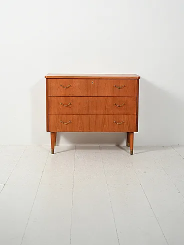 Three drawers in teak with flamed grain, brass handles and tips: clean lines with a discreet deco accent. Compact and rigorous profile, softened by the rounded corners and the warm flaming of the teak, which creates a natural, almost mirror-like design. The arched brass handles and metal tips streamline the whole with a luminous, measured detail. A successful balance between Nordic essentiality and 1950s decorative taste. Good condition. It may show some signs of aging. Please pay attention to the photographs.