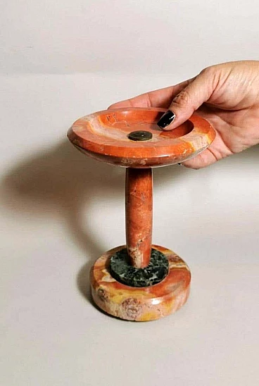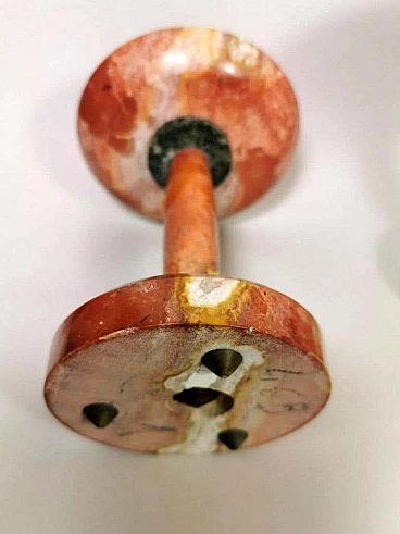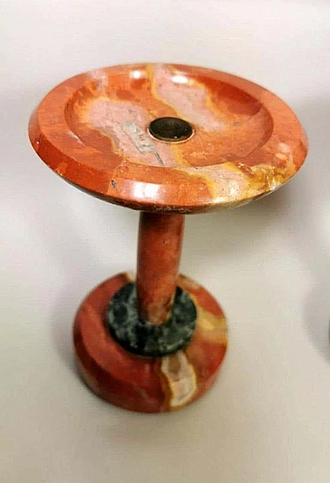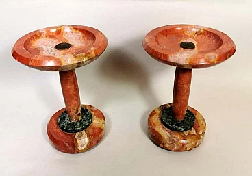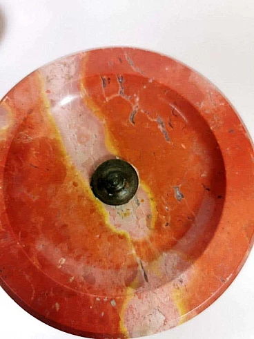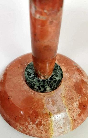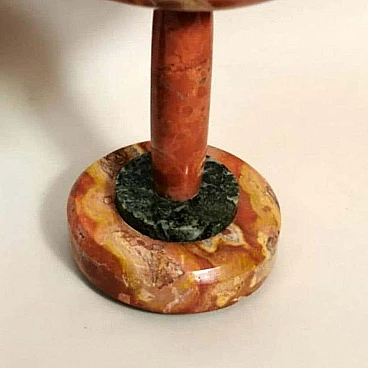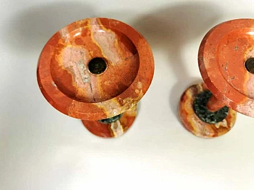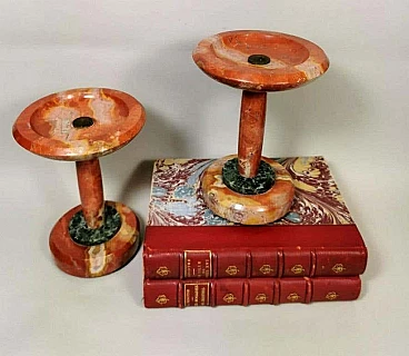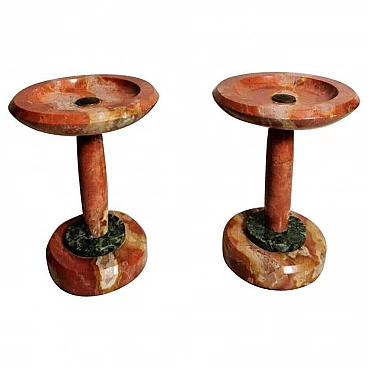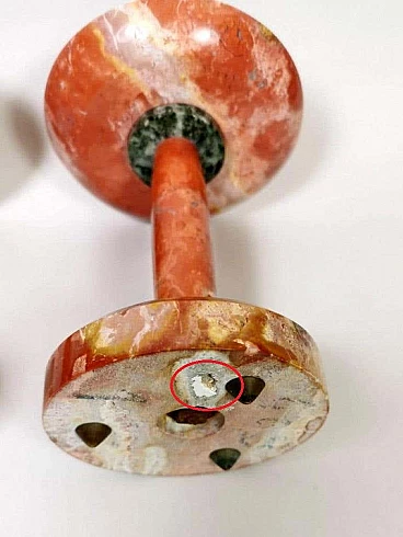 Particular pair of marble cassolettes with bronze finishing. They have a round base with a small central column that supports a circular saucer, under the base there are three bronze feet to improve stability. Always under the base of a cassolette you can notice a repair (see photo). The cassolettes were vases or containers (perfume burners) which were placed on the upper edge of the fireplace mantel in pairs or one on each side next to a clock or a pendulum clock (we also suggest the bookend function). Were very often made of precious metal, bronze or precious marble. This pair belongs to this last category, in fact it is composed of two very particular and rare types of marble: the green one, at the base of the columns, is the Verde Alpi (Alpine Green) which has a dark green background tone that at first glance may seem uniform, but in reality it has an infinite number of light and dark shades and white veins that characterize and distinguish it. Is the marble that has one of the most beautiful shades of green in the world, this type of marble was extracted since ancient times in Val d'Aosta, in the Western Alps and was used in the construction of the Santa Maria Novella Station in Florence in 1848. The other marble is a variety of the rare Arancione Sanguine di Numidian that has a wonderful structure and a very intense orange background crossed by a more or less thick weft of white and yellowish veins. It comes from the quarries of Algiers, but the finishing and polishing are carried out in the area of Carrara (Italy). Is a marble known and appreciated since ancient times. This two ornaments were produced in France between 1870 and 1880 in the Napoleon III style or late Empire.