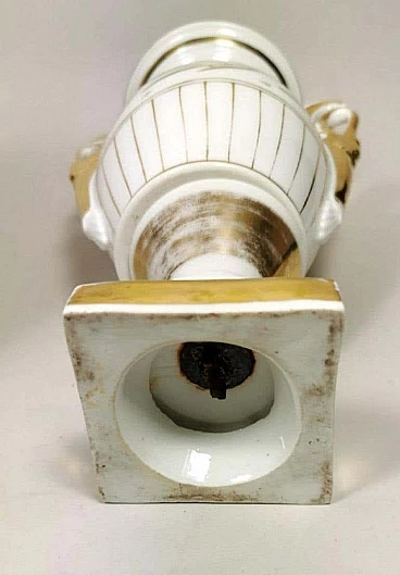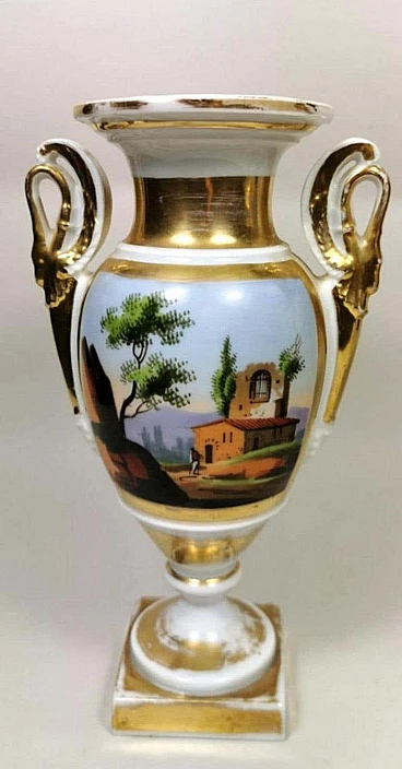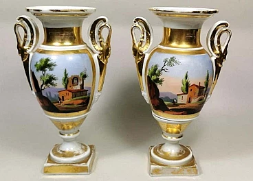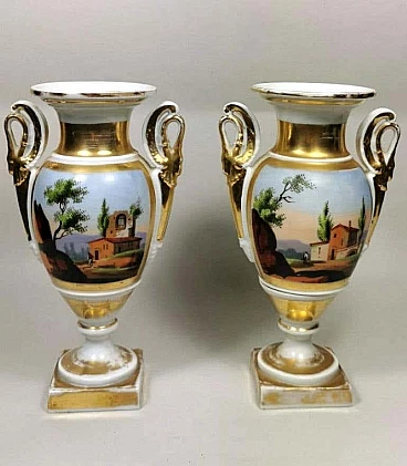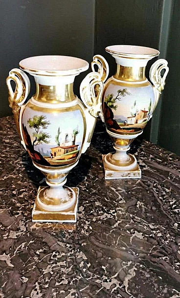 Pair of vases in porcelain de Paris. The delicate and colorful hand painted decorations represent two rural landscapes. While on the back the vases are white with light leaf designs in pure gold, the two vases are then finished in the base, handles, and body always in pure gold, creating a rich and elegant whole. In some parts the pure gold appears worn but this makes the two objects much more fascinating and historically interesting. The pieces were made between 1870 and 1875 respecting ancient traditions and the raw material (kaolin) by master craftsmen.