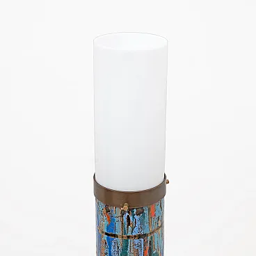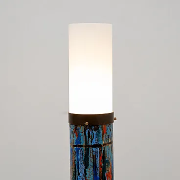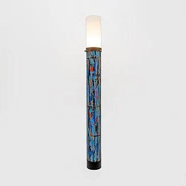 Sculptural Italian floor lamp designed by Angelo Brotto for Esperia, produced in Italy around 1960. The lamp features a thin cylindrical structure in enameled metal and brass, with a richly textured, hand-finished surface that highlights the expressive color variations. It is topped with a cylindrical plexiglass diffuser that emits a soft, ambient light, enhancing the object's verticality and sculptural presence. This design reflects Angelo Brotto's distinctive approach, balancing artisanal experimentation with modernist clarity, and stands as a refined example of mid-century Italian lighting. Functional and highly decorative, the lamp is a perfect furnishing element for sophisticated residential or hospitality interiors. Requires an E27 or E26 bulb with a medium socket.