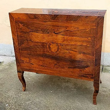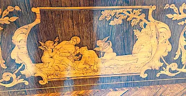 These inlays depict grotesques, with a scene of cherubs pouring nectar on a female figure in the center (suggesting that the piece of furniture was given as a wedding gift, a symbol of fertility). The reverse is inlaid with a coat of arms depicting a comet and a lily. This piece of furniture undoubtedly belonged to a Tuscan family, as it comes from a noble residence in the Florentine countryside. IS