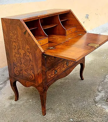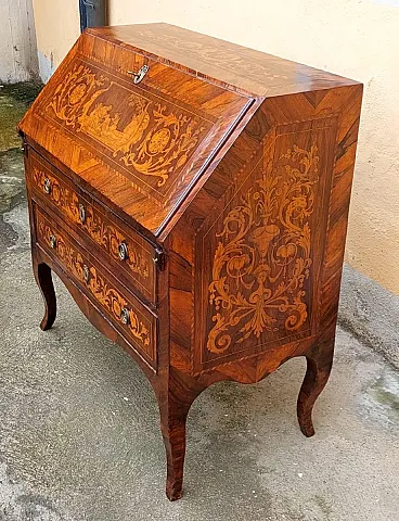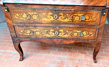 entirely veneered in rosewood with inlays in various essences, convertible legs and an interior with drawers and secret room. The interior is lined with poplar.