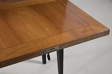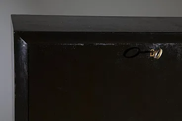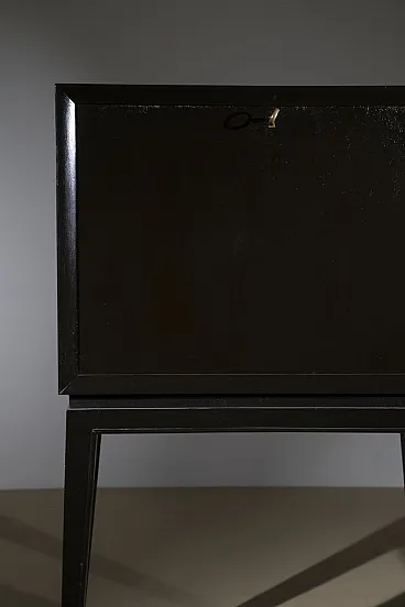A sophisticated Italian bar cabinet from the 1950s, featuring a minimalist and elegant silhouette. The structure is crafted from ebonized wood with a deep black satin finish, characterized by a clean-lined upper compartment supported by slender, tapered legs that exemplify the lightness of mid-century Italian furniture design. The cabinet features a drop-front door (bar flap) with a discreet brass handle, opening to reveal an interior designed for bottle and glass storage. Its architectural proportions and high-quality lacquer work make it an ideal statement piece for a modernist living room or a private office.
