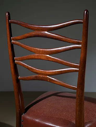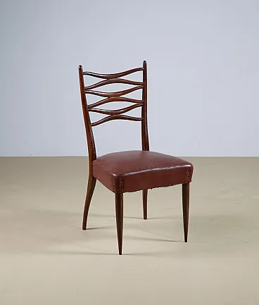 A remarkable set of eight dining chairs designed by the Milanese duo Eugenia Alberti and Gian Luigi Reggio during the 1950s. These chairs are a prime example of the organic modernist aesthetic that defined high-end Italian furniture production in the post-war era. The design is centered around an extraordinary sculptural backrest featuring a series of fluid, wave-like horizontal slats that intersect to create a dynamic "X" pattern. This intricate woodwork is balanced by slender, tapered legs that give the chairs a light and sophisticated profile. The seats are currently upholstered in their original reddish-brown skai (eco-leather), finished with perimeter studs that underscore the artisanal construction of the period. Their collaboration is characterized by a sophisticated approach to organic modernism, where the expressive potential of wood is integrated into innovative, non-linear geometries. Their work, often featuring these signature "X" backrests, represents the bridge between traditional Italian craftsmanship and the avant-garde language of Mid-Century Modernism.