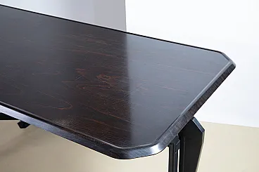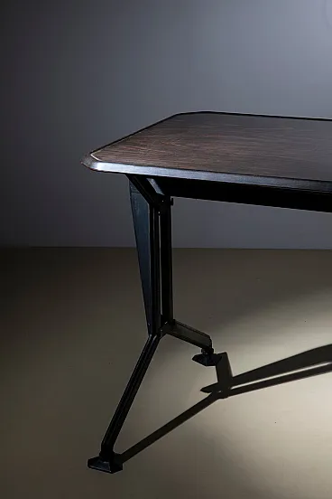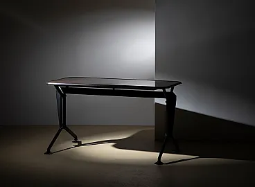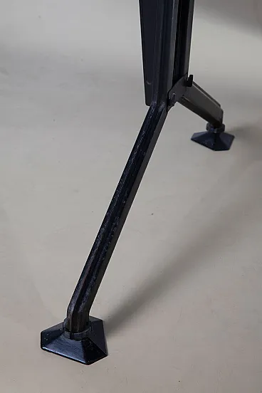 The 'Arco' desk is a masterpiece of Italian industrial design, created in 1963 by the legendary architectural partnership BBPR (Banfi, Belgiojoso, Peressutti, Rogers) for Olivetti. This desk is defined by its architectural elegance and structural clarity. The black-lacquered metal frame features a high-quality iron core and is equipped with the signature adjustable feet, designed to ensure stability and precision. The top is made of polycarbonate with a wood-effect finish, a material choice that perfectly encapsulates the 1960s' fascination with innovative synthetic surfaces that could emulate the warmth of natural materials while offering superior durability. The 'Arco' series is celebrated for its ability to bring architectural dignity to the workplace, reflecting the enlightened corporate culture of Adriano Olivetti. It remains one of the most sought-after examples of 1960s professional furniture, prized for its clean lines and timeless modernist silhouette.