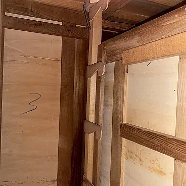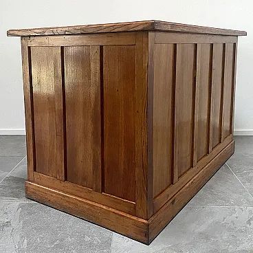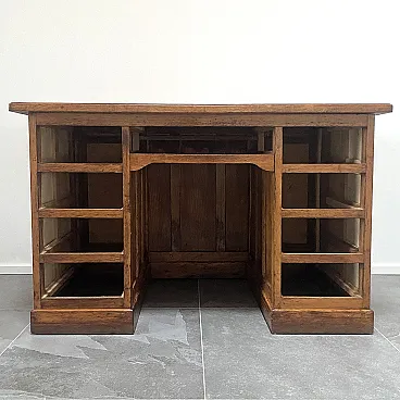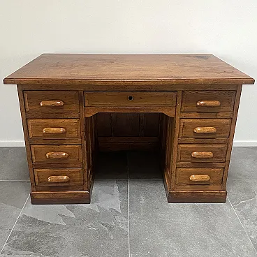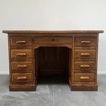 1930s desk in solid oak wood, equipped with nine drawers with poplar interior, eight of which are lateral with wooden handles and a central one with a lock hole (absent) but covered with a brass bushing. This desk is equipped with a particular mechanism at the bottom of the drawers which would allow, by closing only the first one at the top, to block all those below. Conservative restoration carried out, the drawers are all fluid and perfectly functional, the top has been deliberately maintained with the stains and signs of aging visible in the photos.