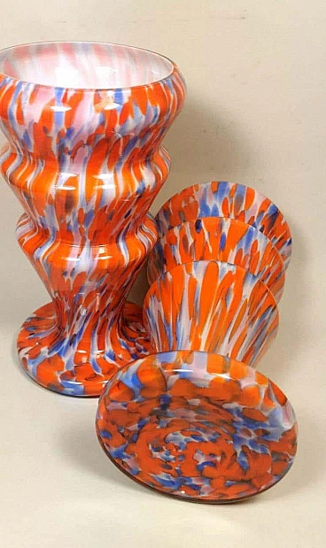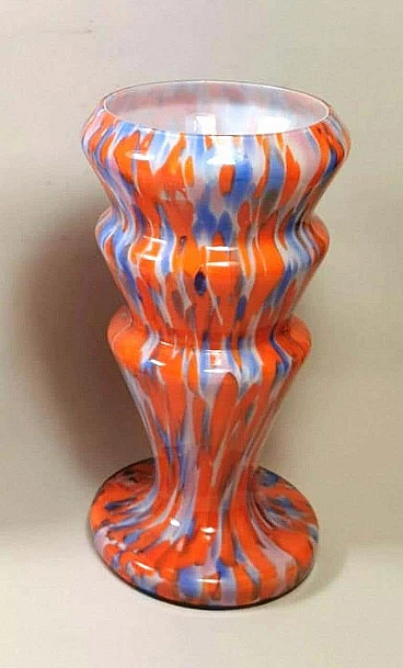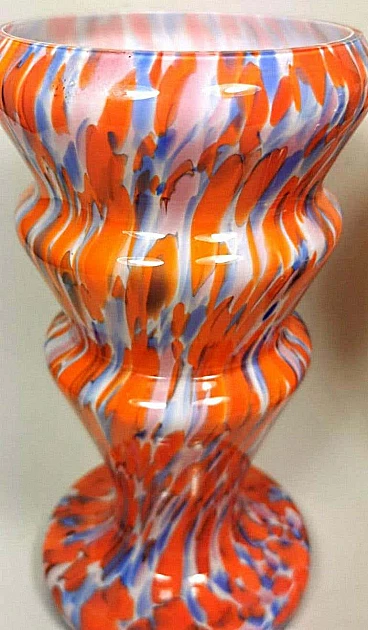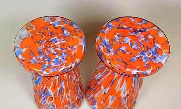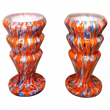 Pair of colored opaline glass vases with original and particular shape. They were blown in one piece (body and base), seamless, then shaped with skill by skilled craftsmen of Clichy glassworks in France between 1960 and 1964. The most difficult and particular operation was to leave the opaline white inside and make the outside with different colors. Some colored oxides were applied when the draft of the white opalescent vase had already come out of the furnace. At the precise moment when they began to melt and amalgamate with the white, the craftsman began blowing and modeling the vase, quickly and quickly, so that the colors were distributed only on the surface of the object without penetrating, as if they were brushstrokes, then put the vase back in the furnace for a very short time and then proceeded to a quick cooling. An operation that not everyone is able to do, in fact, it is delegated only to the glass masters. The Clichy glassworks is a glass factory founded in Pont-de-Sevres in 1837 and moved to Clichy-la-Garenne, near Paris, in 1839.